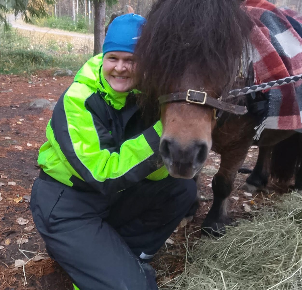 Kuvassa olen ystäväni shetlanninponin Hertan kanssa vaellusretken tauolla. Hertta on äärimmäisen luotettava, se ei tee mitään tyhmyyksiä, mutta välillä innostuu täyteen laukkaan pelkästä menemisen ilosta. Silloin on parempi löysätä ohjia ja vain nauttia kyydistä.